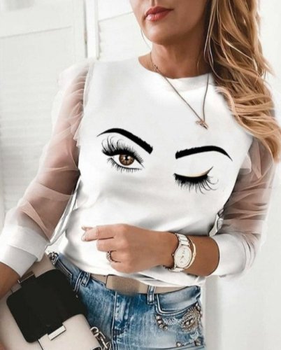 • Kadın uzun kollu bisiklet yaka göz baskılı kolları tül detay dalgıç bluz