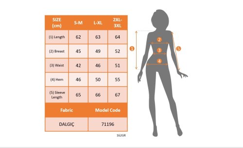 • Modelin Ölçüleri: Boy:165, Kilo:55, Göğüs:90, Bel:72, Kalça: 100